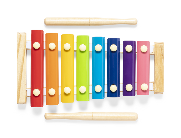 Xilófono con base y baquetas en madera natural de pino. Teclas metálicas multicolor y presentado en caja individual de diseño kraft.